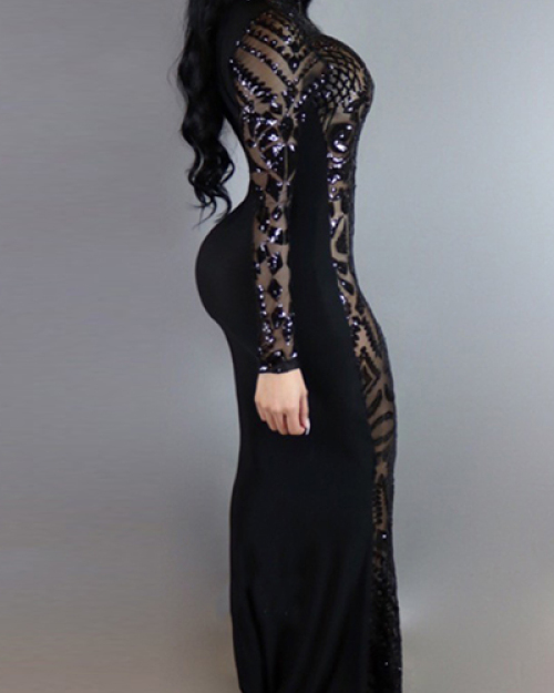 Charming Round Neck Long Sleeves Sequins Decoration Black Milk Fiber Sheath Ankle Length Dress