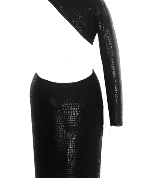 Cheap Sexy O Neck One Shoulder Long Sleeve Back Hollow-out Cobra Black PU Sheath Mini Bodycon Dress