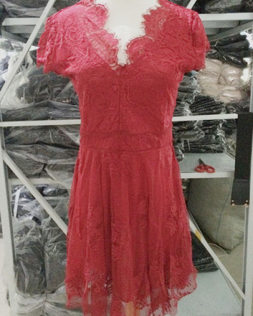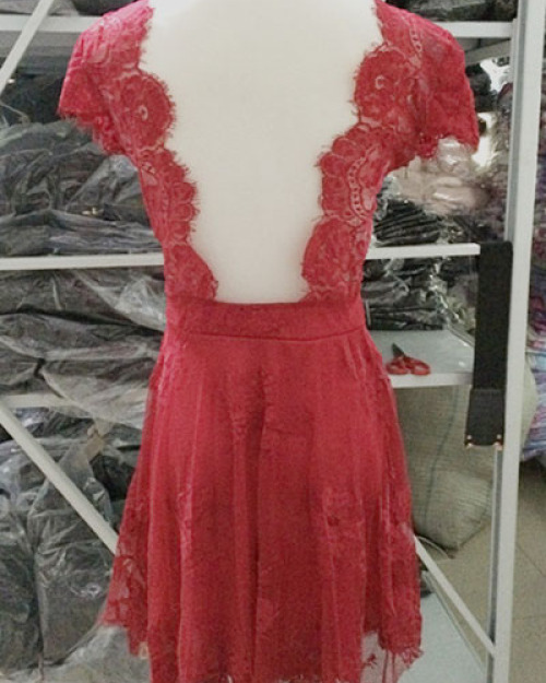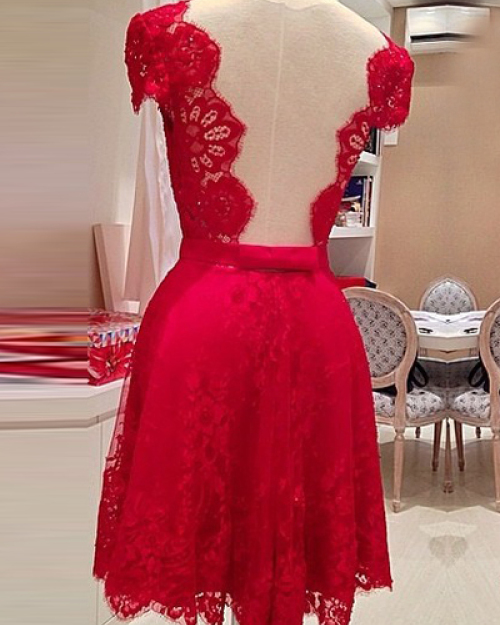 Cheap Sexy V Neck Short Sleeves Backless Red Lace Mini Dress