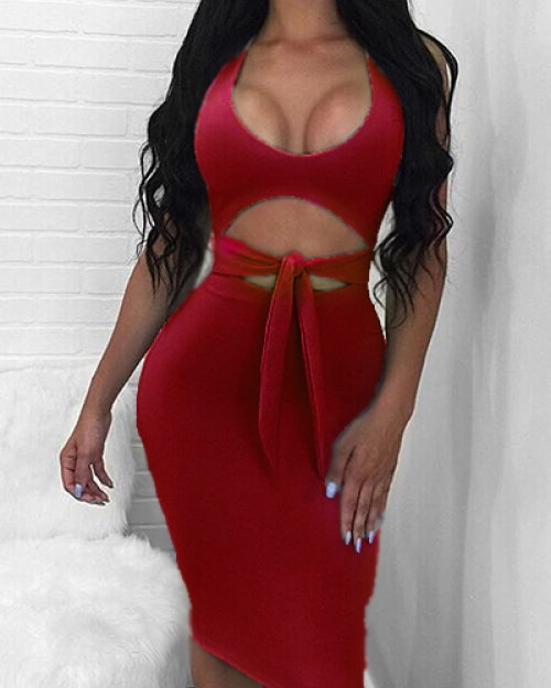 Euramerican Deep V Neck Hollow-out Red Twilled Satin Knee Length Dress