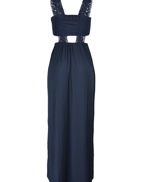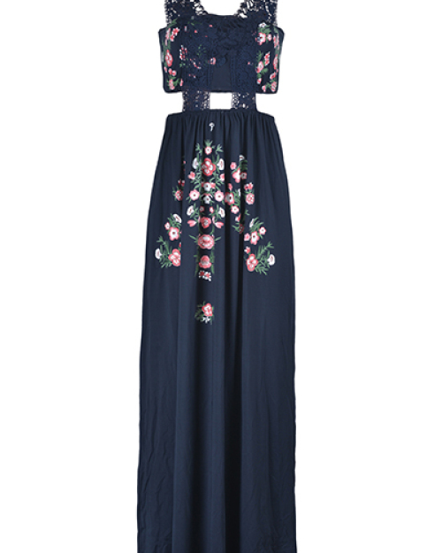 Euramerican Printed Hollow-out Navy Blue Polyester Floor Length Dress