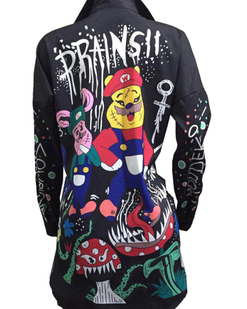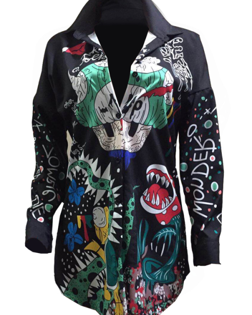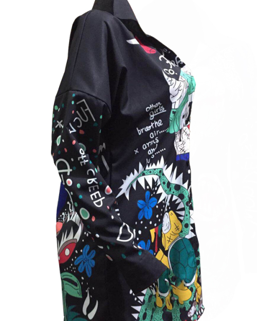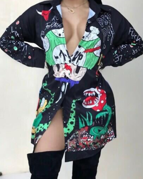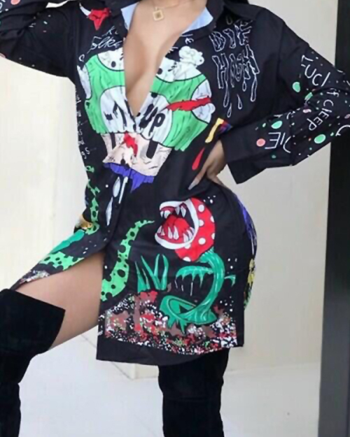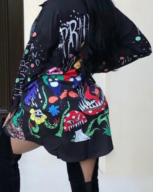 Euramerican Turndown Collar Printed Polyester Mini Shirt Dress