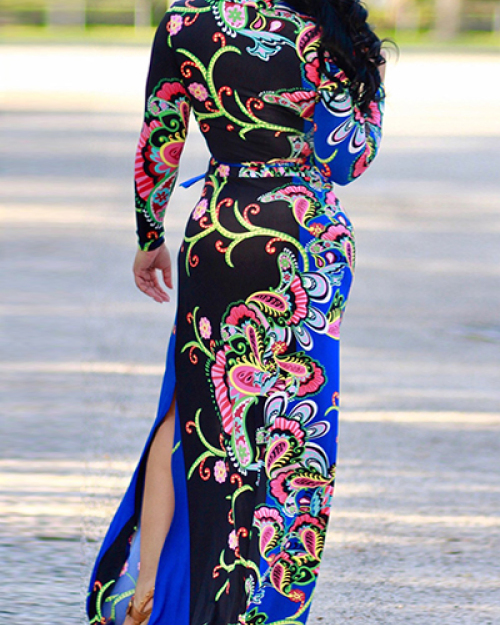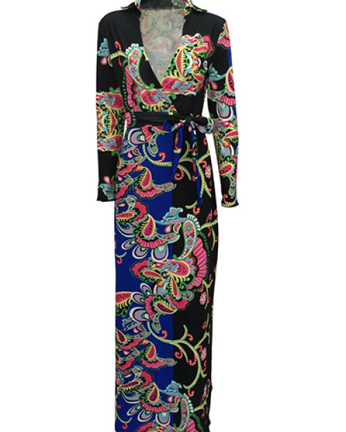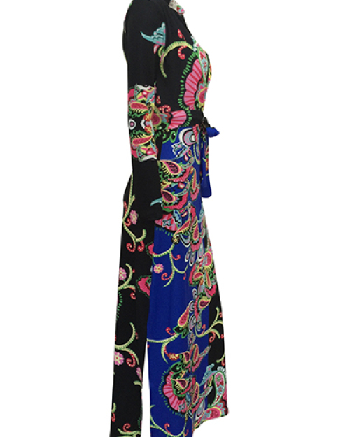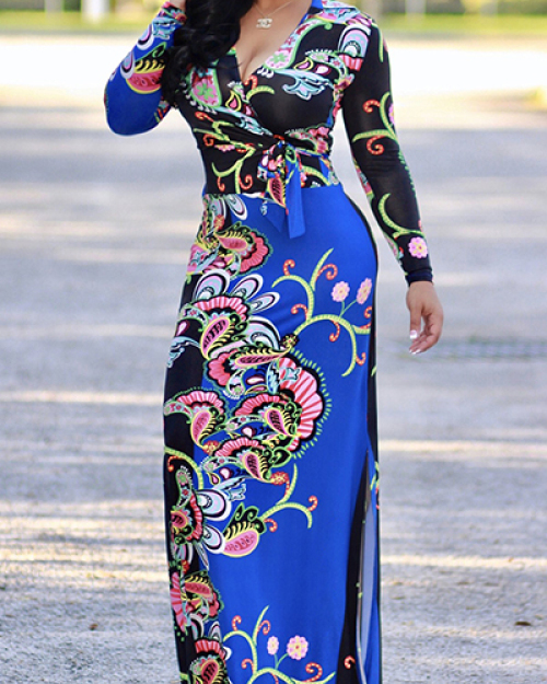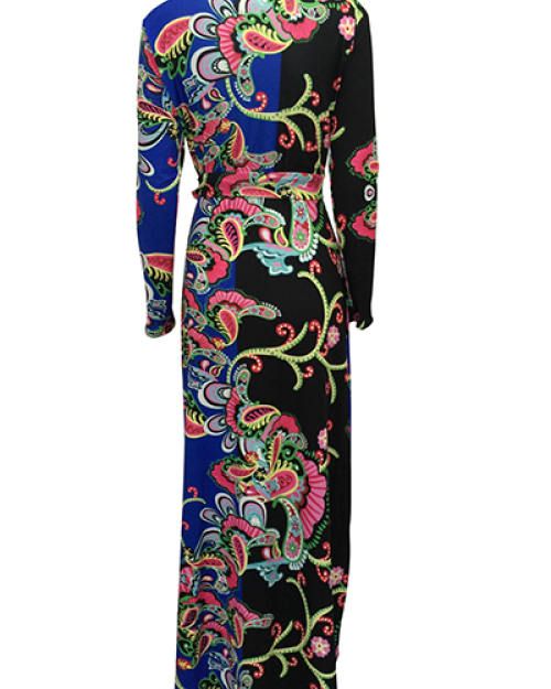 Euramerican V Neck Long Sleeves Floral Print Blue Healthy Fabric Floor Length Dress