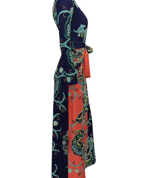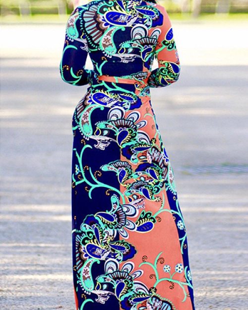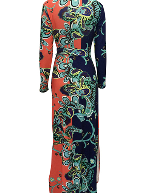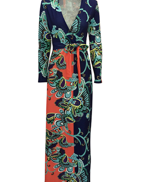 Euramerican V Neck Long Sleeves Floral Print Orange Healthy Fabric Floor Length Dress