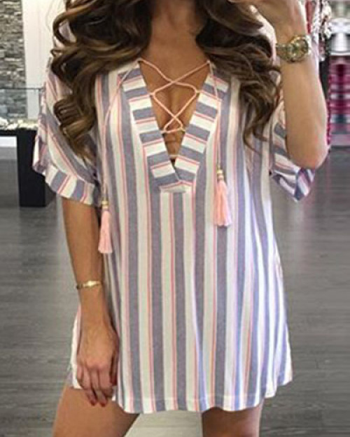 Euramerican V Neck Short Sleeves Striped Polyester Mini Dress