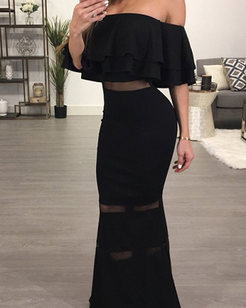 Fashion Dew Shoulder Falbala Design Black Polyester Sheath Floor length Dress