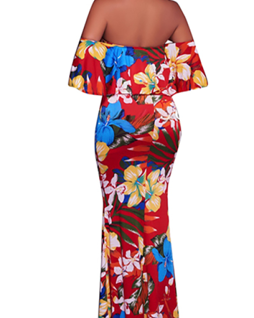 Fashion Floral Print Red Milk Fiber Ankle Length Dress