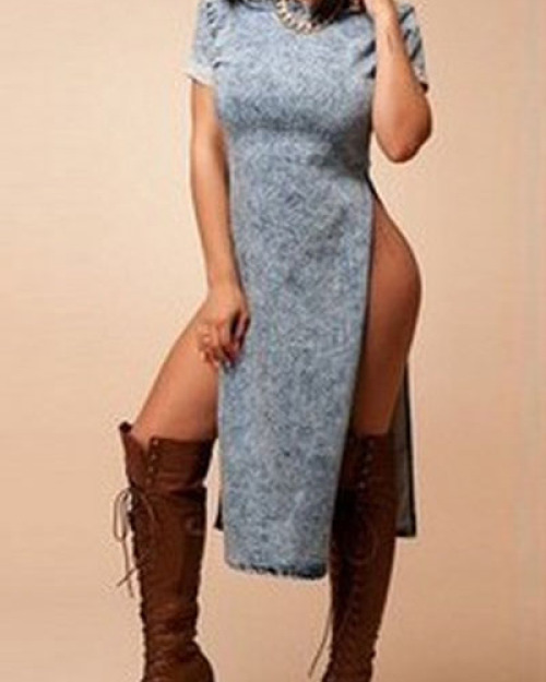 Fashion O Neck Short Sleeves Sides Split Blue Blending Knee Length Dress