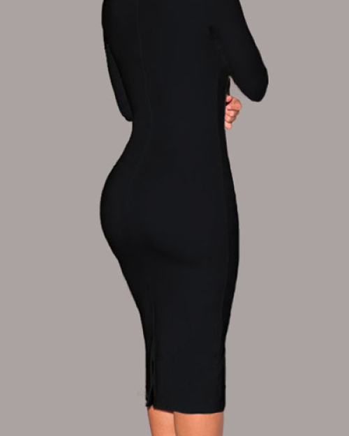 Fashion Sexy V Neck Long Sleeves Black Cotton Blend Sheath Knee Length Women Dress