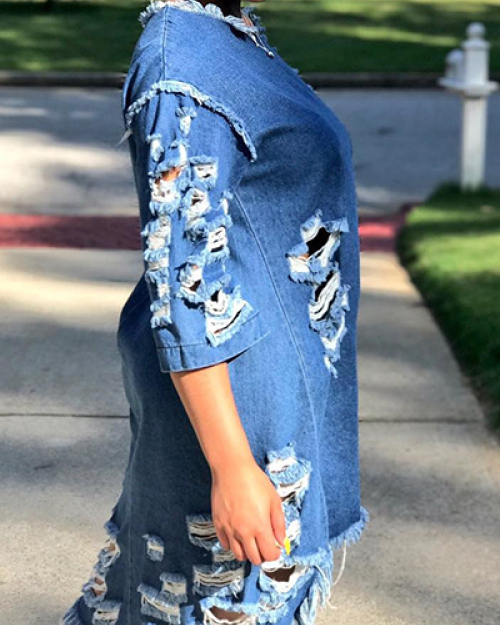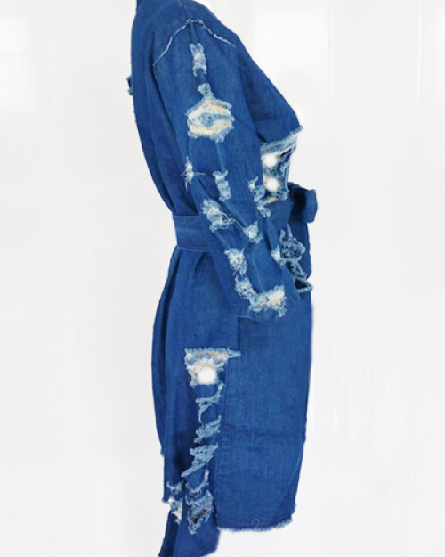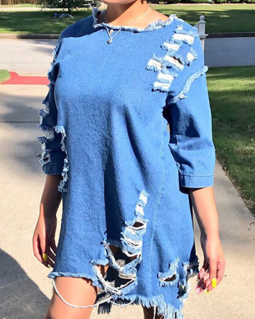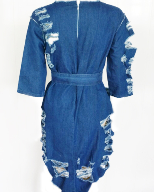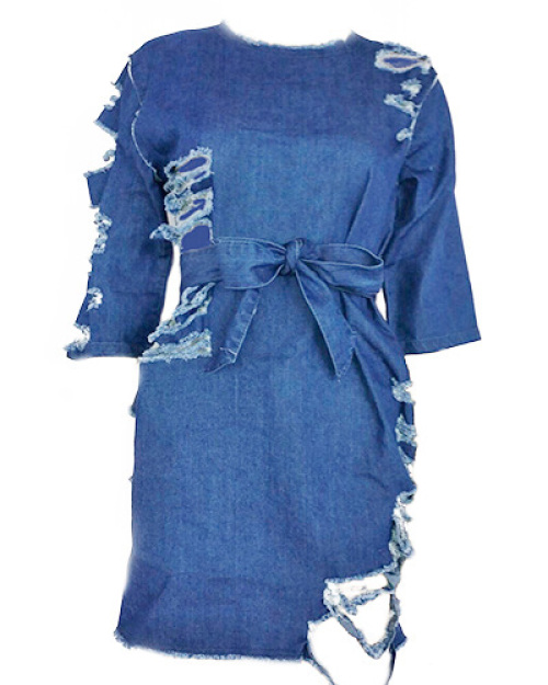 Leisure Round Neck Half Sleeves Blue Denim Mini Dress(With Belt)