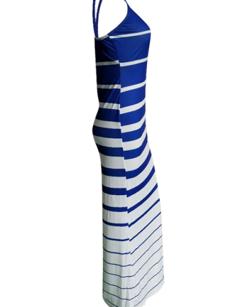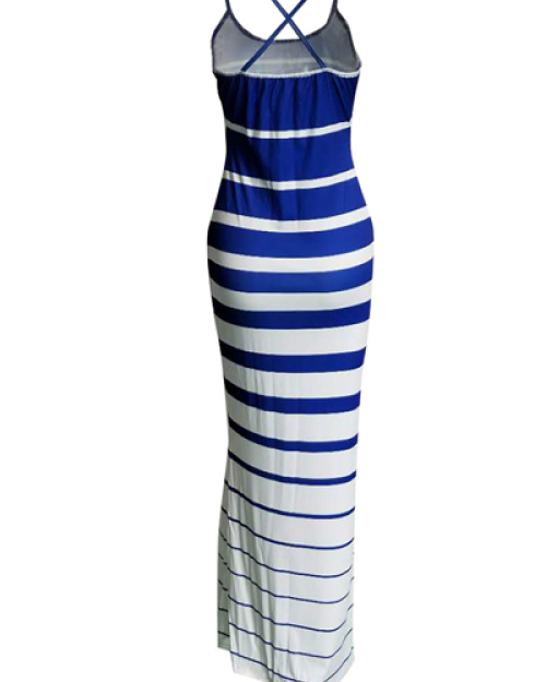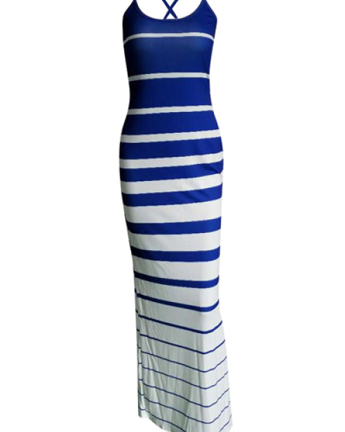 Leisure Striped Printed Blue-white Twilled Satin Sheath Floor Length Dress