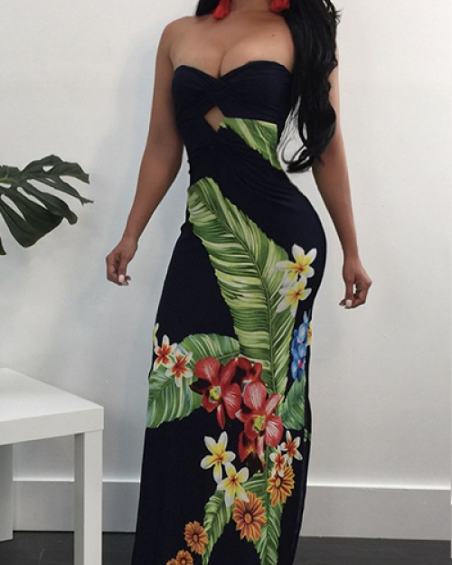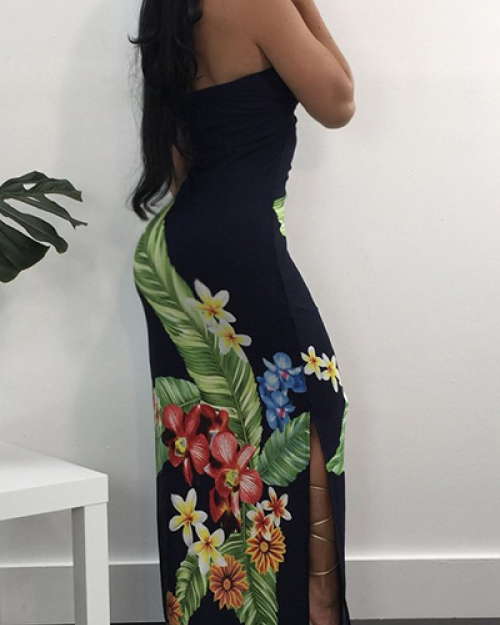 Sexy Backless Printed Twilled Satin Sheath Floor Length Dress