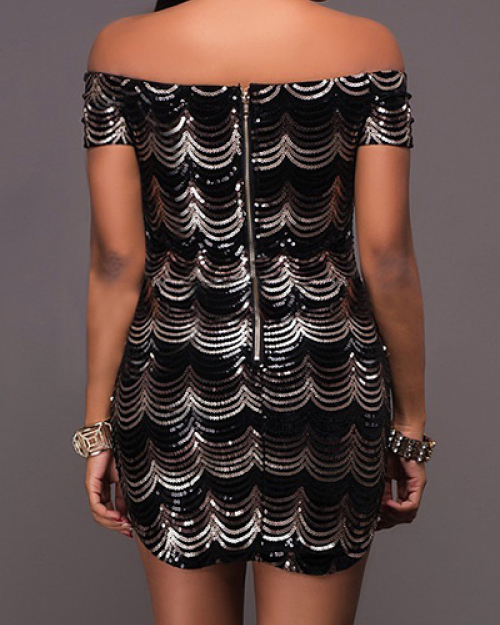 Sexy Bateau Neck Short Sleeves Sequined Decorative Black Polyester Sheath Mini Dress