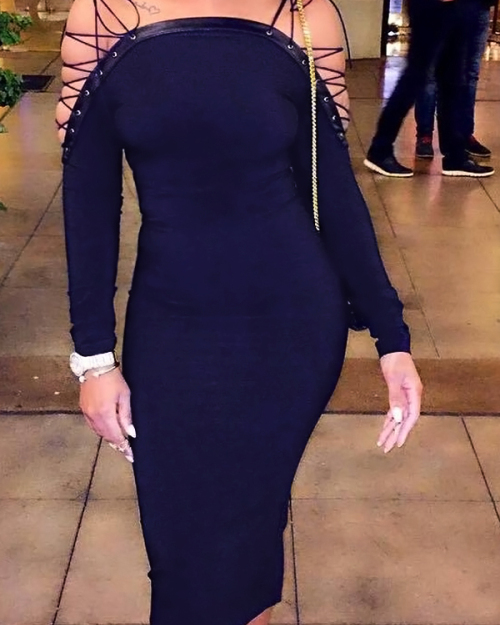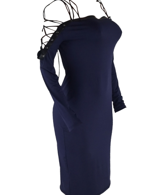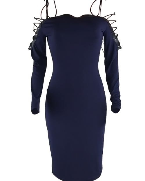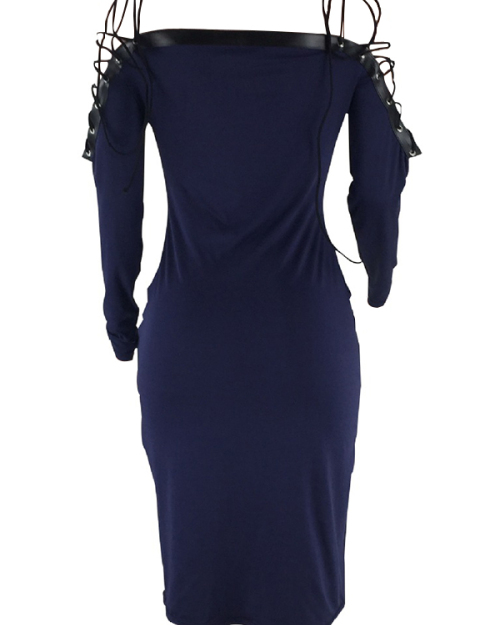 Sexy Bateau Neck Shoulders Lace-up Dark Blue Polyester Mid Calf Dress