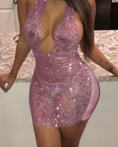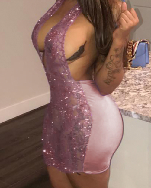 Sexy Deep V Neck Sequined Decorative Pink Polyester See-Through Mini Backless Dress