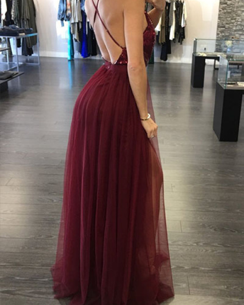 Sexy Deep V Neck Sleeveless Wine Red Gauze Floor Length Dress