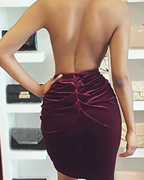 Sexy Euramerican Halter Neck Sleeveless Backless Wine Red Velvet Mini Dress
