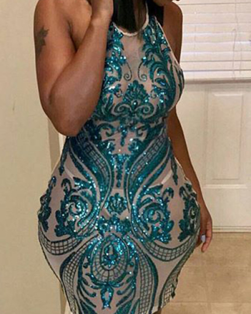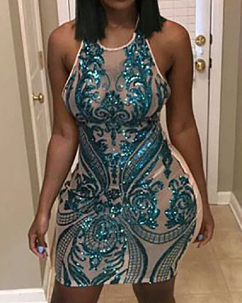 Sexy Gauze Patchwork Light Blue Sheath Knee Length Dress