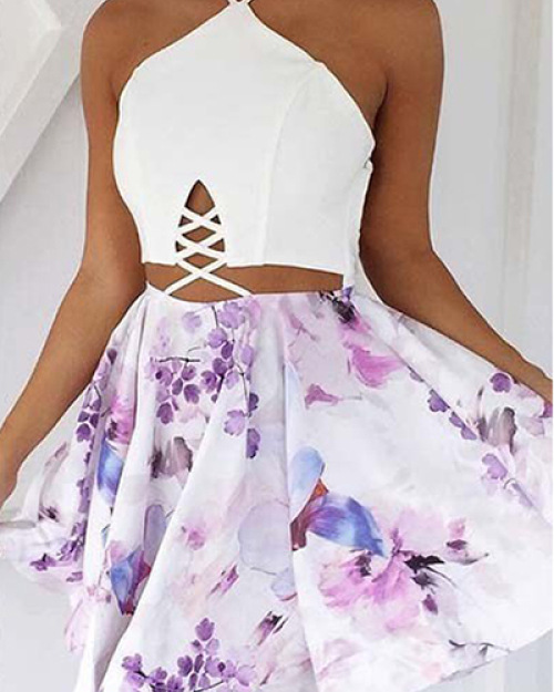 Sexy Lace-up Backless Printed Polyester Mini Dress