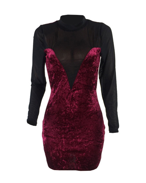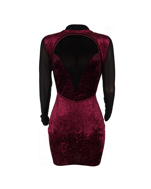 Sexy Round Neck Backless See-Through Wine Red Polyester Sheath Mini Dress