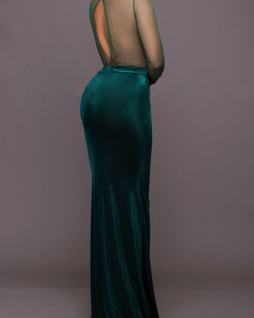 Sexy Round Neck Long Sleeves Gauze Patchwork Green Velvet Sheath Floor Length Dress