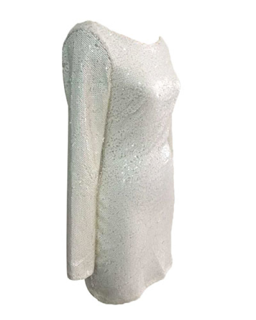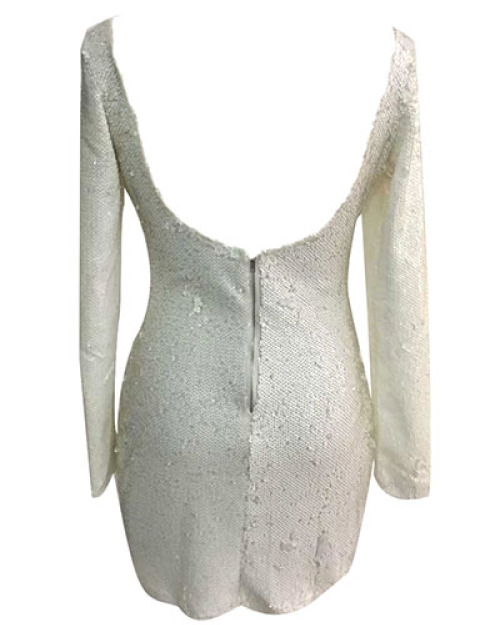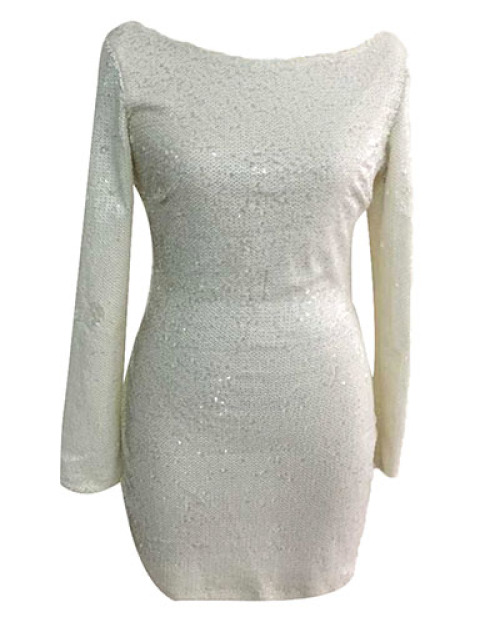 Sexy Round Neck Long Sleeves Sequined Decorative White Sheath Mini Dress