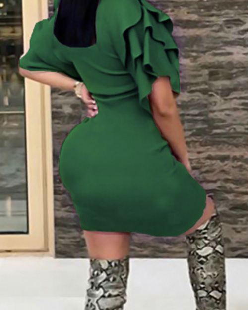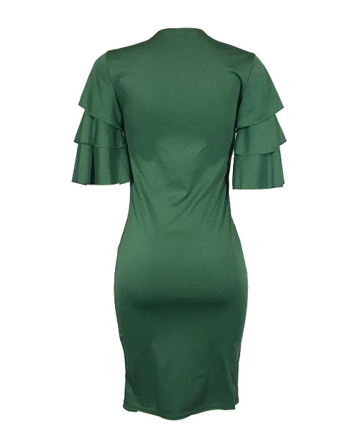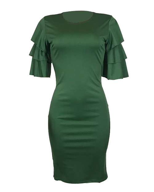 Sexy Round Neck Ruffle Sleeves Green Polyester Knee Length Dress