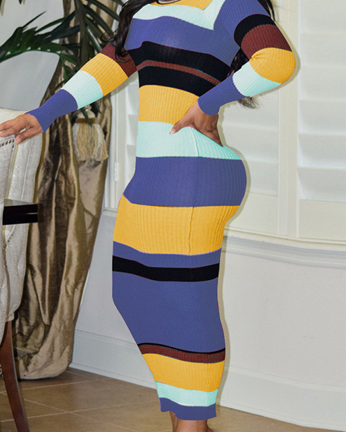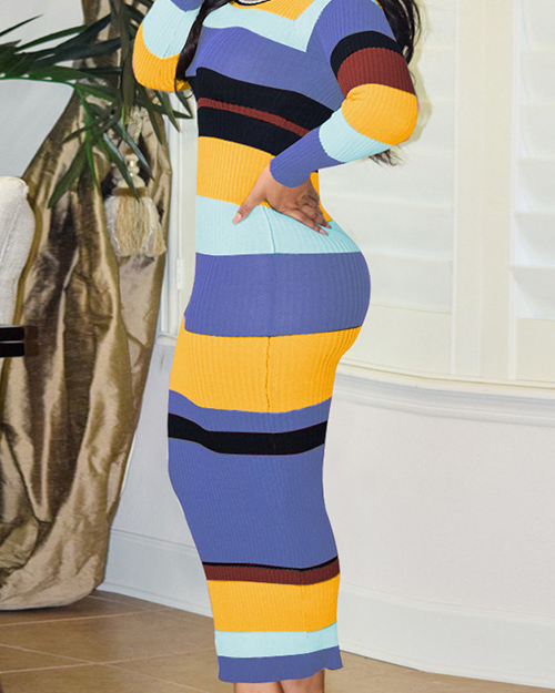 Sexy Round Neck Striped Patchwork Purple Polyester Ankle Length Dress