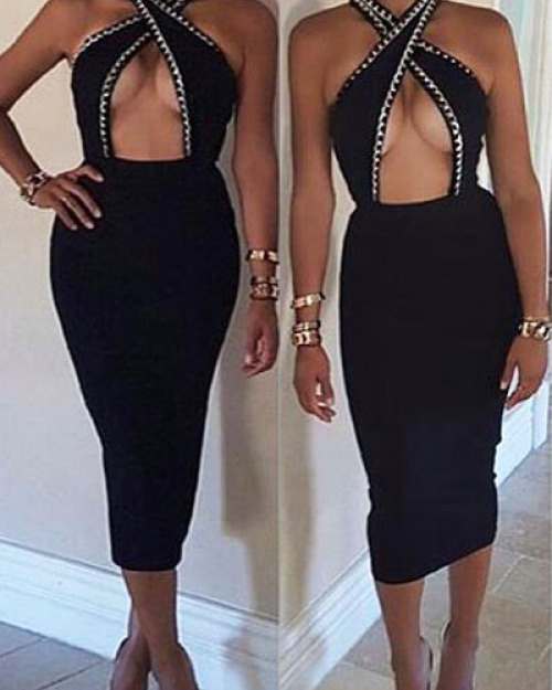 Sexy Sleeveless Hollow-out Black Polyester Sheath Knee Length Dress