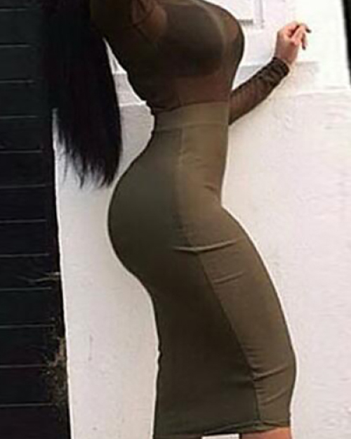 Sexy Turtleneck Long Sleeve Mesh Patchwork Hollow-out Green Polyester Sheath Knee Length Dress