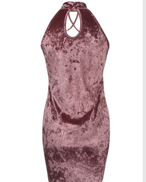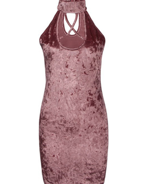 Sexy Turtleneck Sleeveless Hollow-out Pink Velvet Sheath Mini Dress