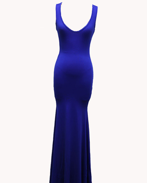 Sexy U-shaped Neck Sleeveless Blue Cotton Blend Sheath Floor Length Dress