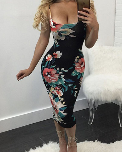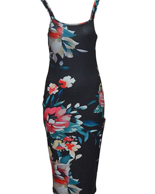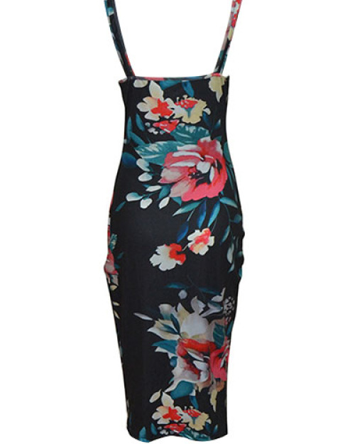 Sexy U-shaped Neck Sleeveless Floral Print Black Milk Fiber Sheath Knee Length Dress