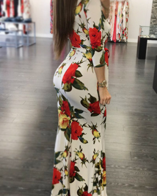 Sexy V Neck Floral Print White Cotton Sheath Ankle Length Dress(Non Positioning Printing) Sexy V Neck Floral Print White Cotton Sheath Ankle Length Dress(Non Positioning Printing)