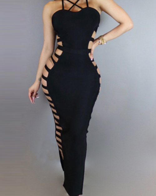 Sexy V Neck Sleeveless Hollow-out Black Polyester Ankle Length Dress