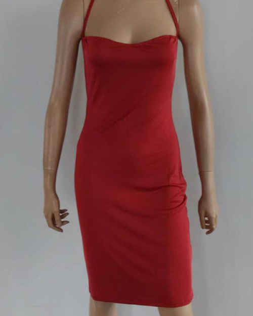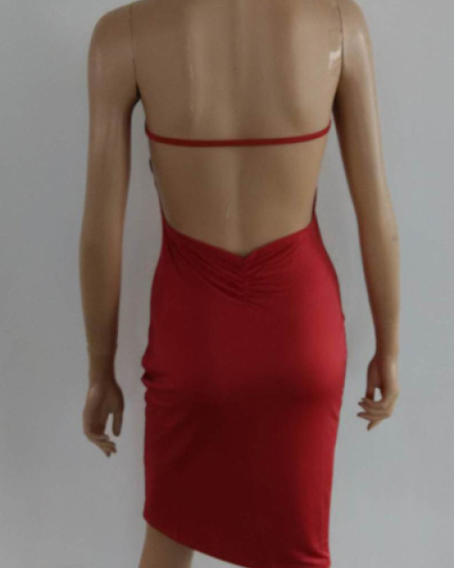 Sexy V Neck Spaghetti Strap Sleeveless Backless Red Polyester Sheath Mini Dress