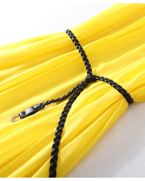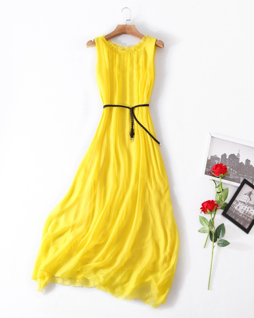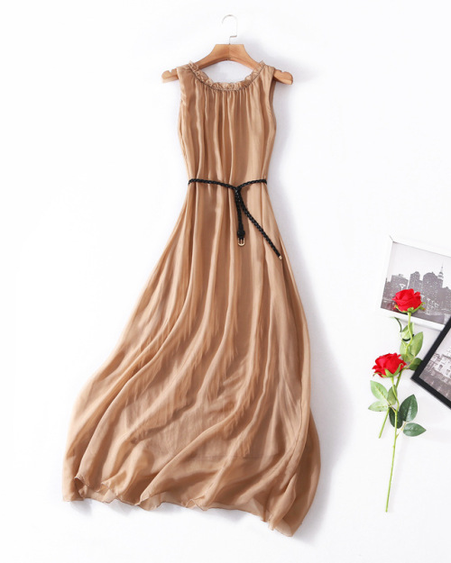 Sleeveless silk summer boutique dress belted waist train loose MIDI skirt #95051