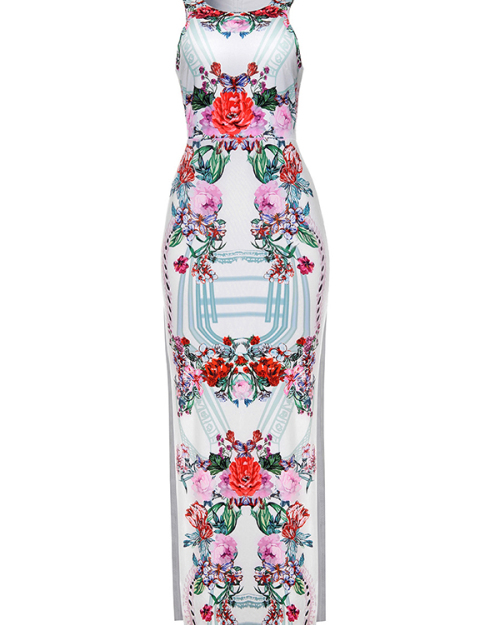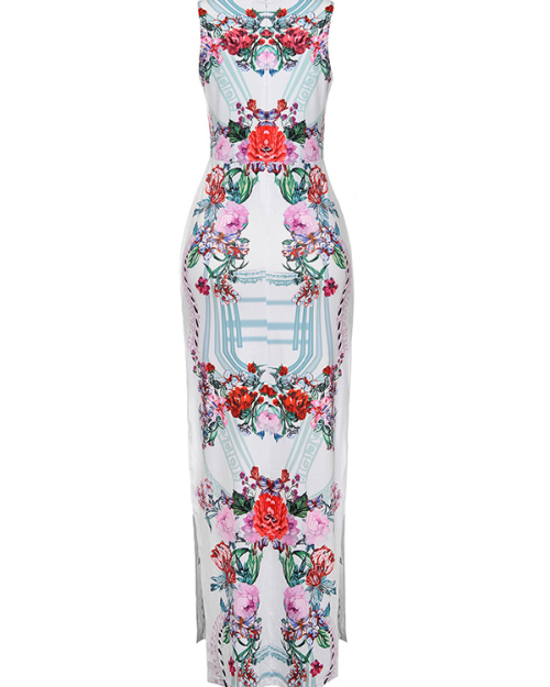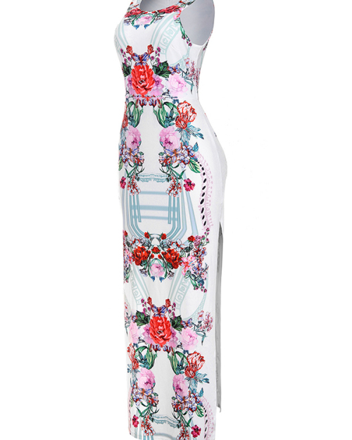 Stylish Round Neck Spaghetti Strap Sleeveless Floral Print Qmilch Sheath Ankle Length Dress