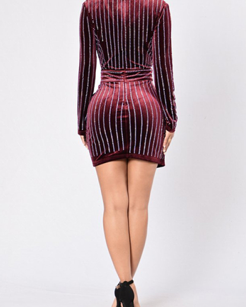 Stylish V Neck Long Sleeves Rhinestone Decorative Wine Red Velvet Sheath Mini Dress