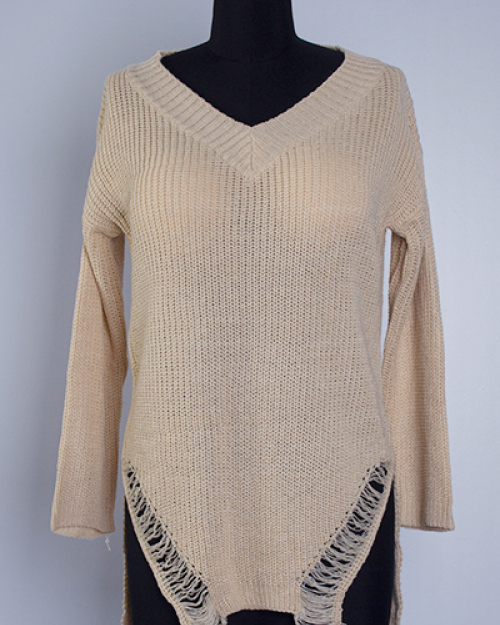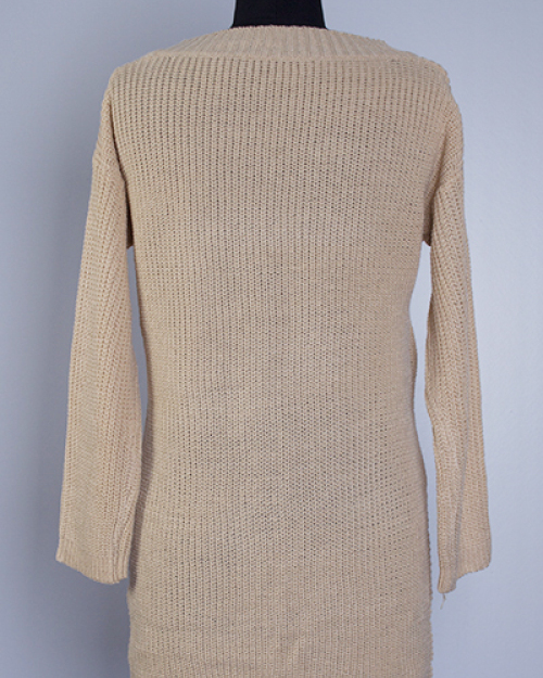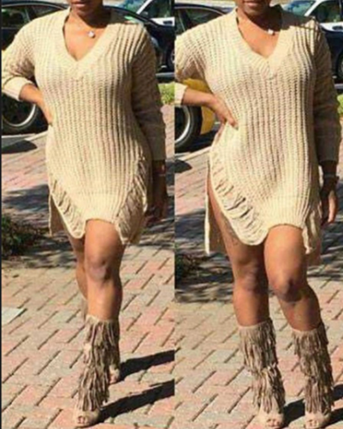 Stylish V Neck Long Sleeves Sides Split Cotton Blend A Line Mini Sweater Dress
