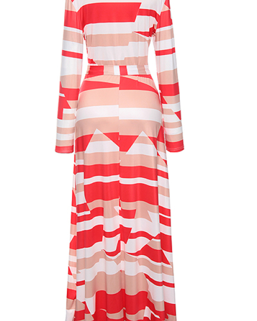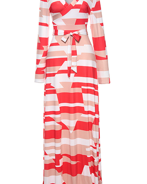 Stylish V Neck Printed White Healthy Fabric Ankle Length Dress (With Belt)