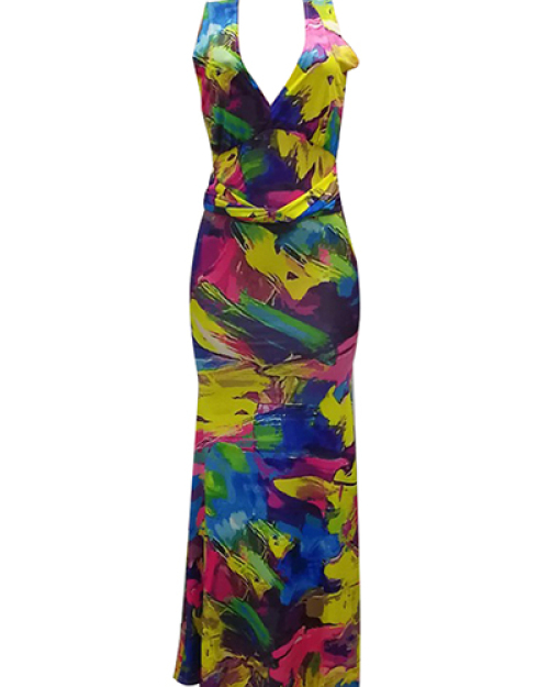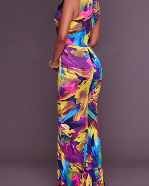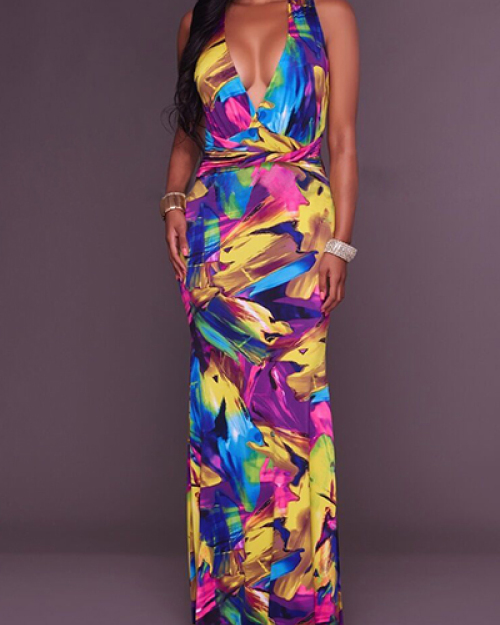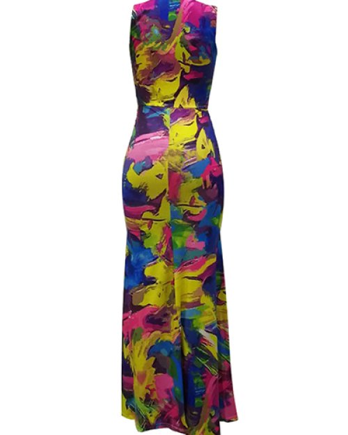 Stylish V Neck Tank Sleeveless Printed Milk Fiber Floor Length Dress