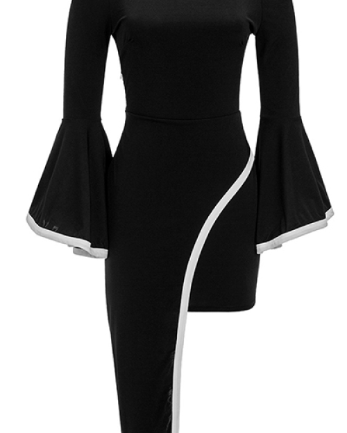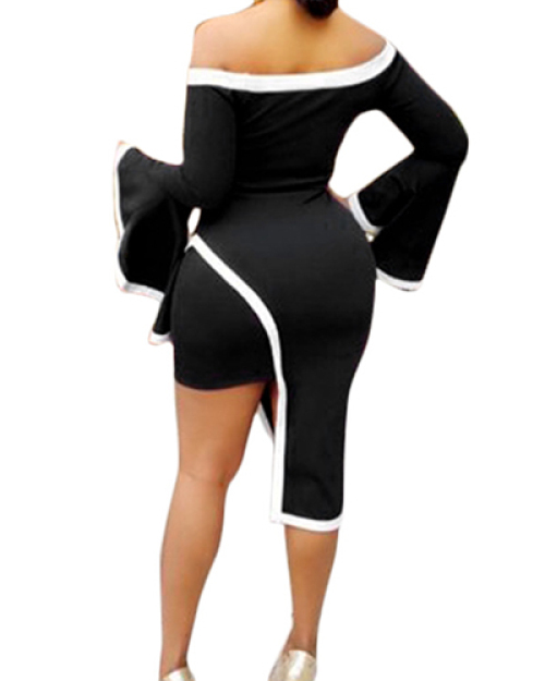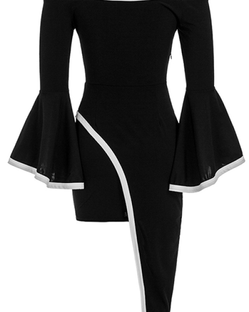 Trendy Bateau Neck Dew Shoulder Long Sleeves Asymmetrical Black Healthy Fabric Knee Length Dress