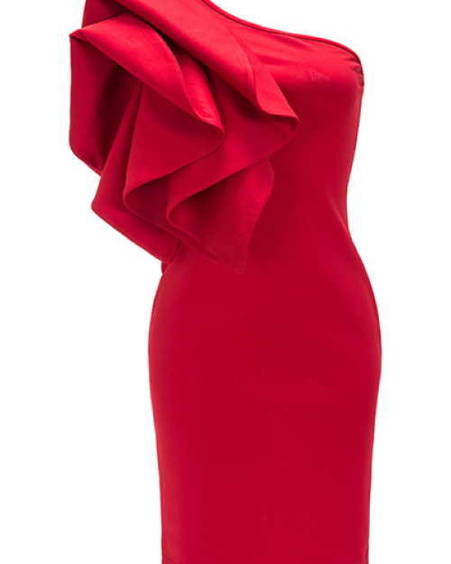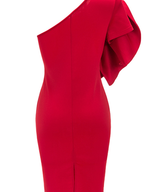 Trendy Boat Neck One Shoulder Sleeveless Falbala Design Red Healthy Fabric Sheath Knee Length Dress