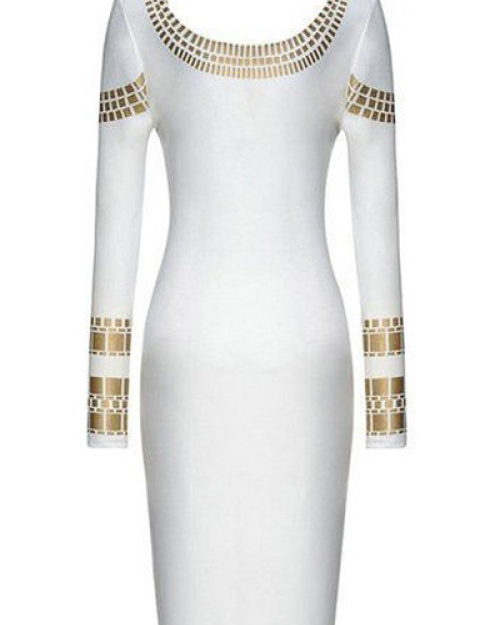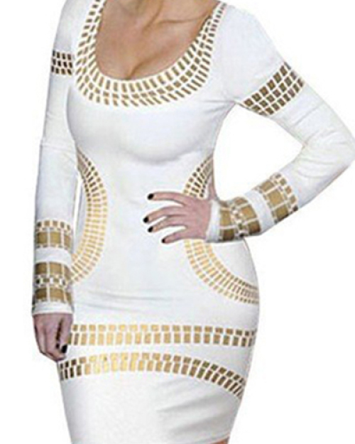 Trendy O Neck Long Sleeves Bronzing Print White Cotton Blend Sheath Mini Dress