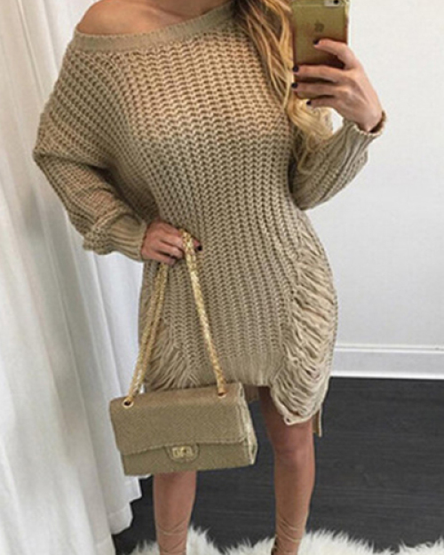 Trendy Round Neck Long Sleeves Hollow-out Asymmetrical Khaki Acrylic Mini Dress