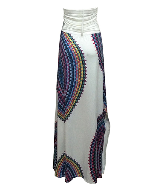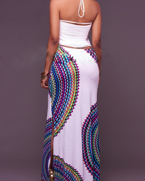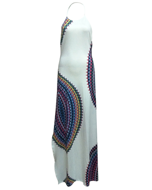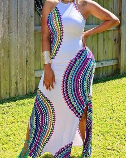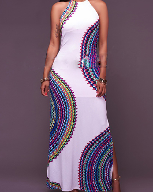Trendy Round Neck Sleeveless Printed Backless Milk Fiber Floor Length Dress