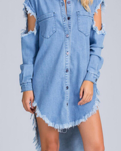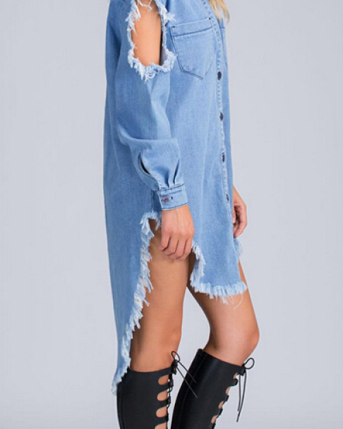 Trendy Turndown Collar Long Sleeves Asymmetrical Blue Denim A Line Mini Dress