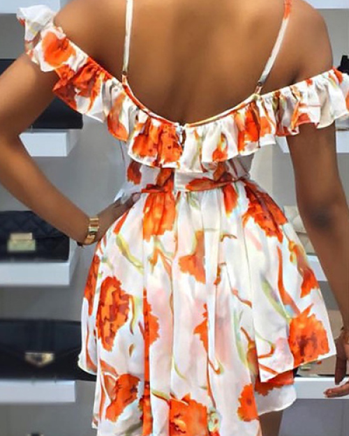 Trendy V Neck Spaghetti Strap Short Sleeves Printed Backless Mini Dress