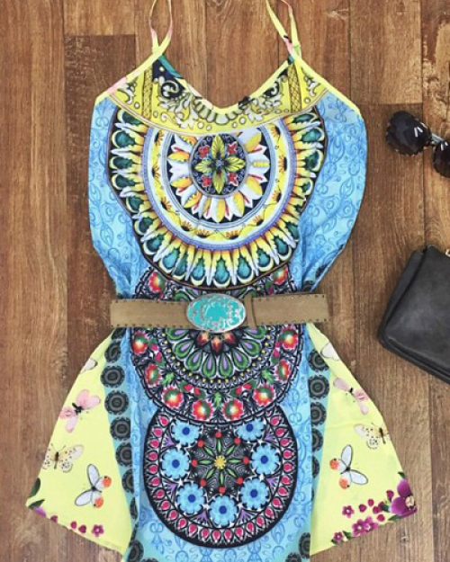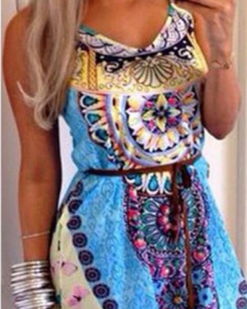 Vintage O Neck Spaghetti Strap Sleeveless Patchwork Print Blue Polyester Mini Dress